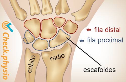 En la articulación de la muñeca hay ocho huesos carpianos. Se dividen en dos filas imaginarias adyacentes y juntas forman la transición del antebrazo a la mano. La fila adyacente al antebrazo se denomina "fila proximal". La otra fila, situada más cerca de la mano, se denomina "fila distal".